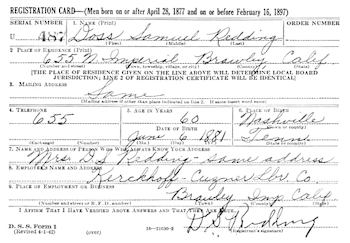Birth Born on June 06, 1881 in Nashville, Davidson Co., TN Death Died on January 23, 1948 in Brawley, Imperial Co., CA Marriages FISHER, Blanche Martin Married on December 26, 1908 in Austinville, Morgan Co., AL Children REDDING, Louise Donal: February 02, 1908 REDDING, Carl A.: 1911 Notes Occupation: Lumberman Images Doss Redding WW1 Draft Doss Redding WW2 Draft Blanche M. Fisher Marriage