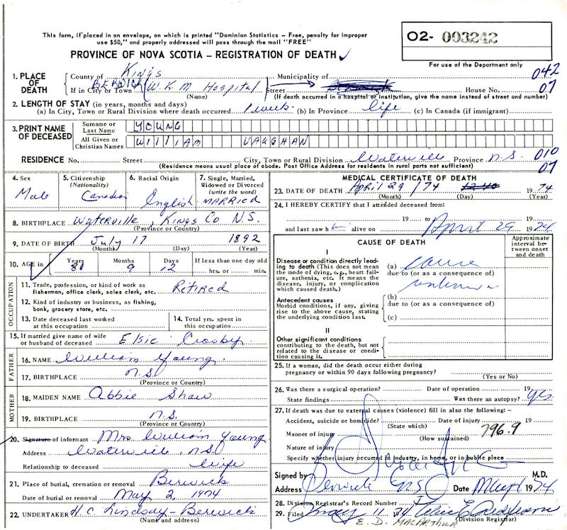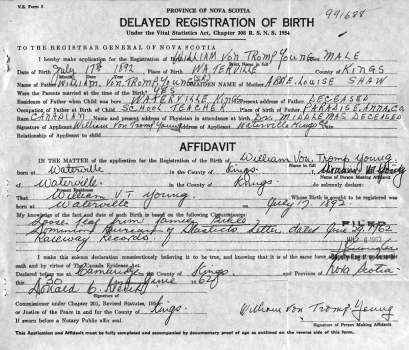 Parents Father: YOUNG, William Admiral Von Tromp Mother: SHAW, Abbie Louisa Birth Born on July 17, 1892 in Waterville, Kings Co., NS Death Died on April 29, 1974 in Berwick, Kings Co., NS Buried in Berwick Cemetery in Berwick, Kings Co., NS Marriages WOLLARD, Elsie Lilah (Crosby) Married on October 02, 1924 in Yarmouth, Yarmouth Co., NS KING, Flossie Kathleen Married on September 15, 1915 in Annapolis Royal, Annapolis Co., NS Children YOUNG, William Arthur: August 06, 1918 - February 04, 2002 Notes Occupation: Train Conductor Death: Cancer Sources Nova Scotia Deaths: Year 1974 #3242 Images William Young Birth William & Elsie (Wollard) Young William Young Death William Young Jr Marriage William Young Jr Marriage2