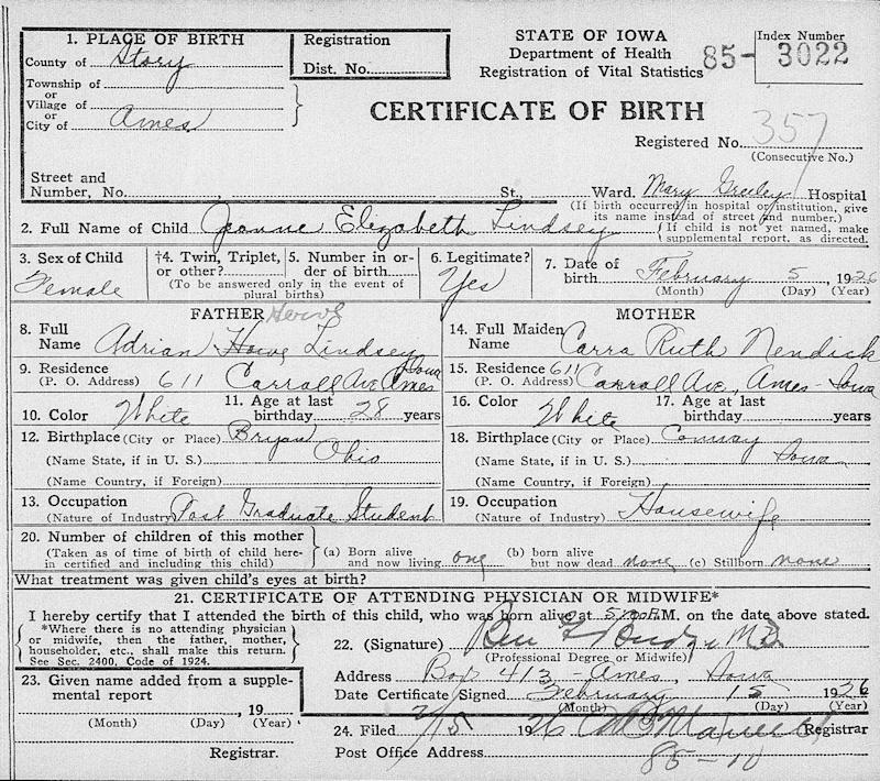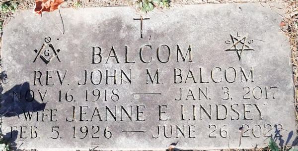 Parents Father: LINDSEY, Adrian Herve Mother: NENDICK, Carra Ruth Birth Born on February 05, 1926 in Ames, Story Co., IA Death Died on June 26, 2022 in Massachusetts, USA Buried in Wildwood Cemetery in Amherst, Hampshire Co., MA Marriages BALCOM, John Murray Married on June 14, 1946 in Amherst, Hampshire Co., MA Children BALCOM, Dianne Elizabeth: May 20, 1947 BALCOM, John Lindsey: October 03, 1949 - June 22, 2021 BALCOM, Adrianne Carol: March 06, 1951 Sources Massachusetts Cemeteries: Wildwood Cemetery Amherst,MA Images Jeanne Lindsey Birth John & Jeanne (Lindsey) Balcom