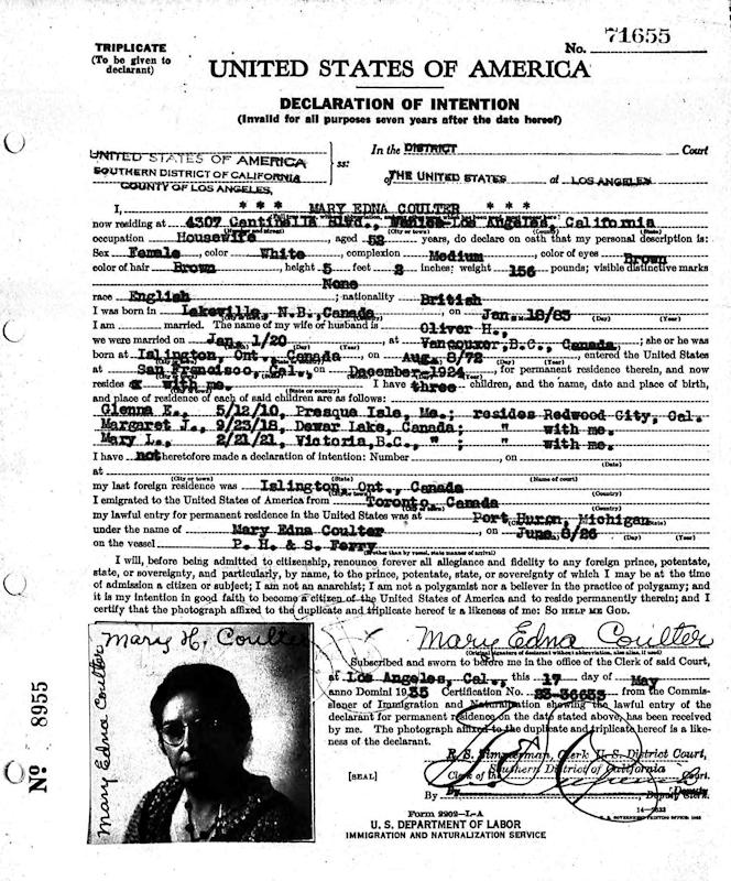 Parents Father: FOWLER, James Rulofson Mother: DEFOREST, Anne Matilda Birth Born on January 18, 1883 in Lakeville, Carleton Co., NB Death Died on September 03, 1962 in Los Angeles, Los Angeles Co., CA Buried in Chapel Of The Pines Crematory in Los Angeles, Los Angeles Co., CA Marriages COULTER, Oliver Henry Married on 1920 in Saskatchewan, Canada HOWDEN, Arthur Duncan Married on August 01, 1908 in Centreville, Carleton Co., NB Children HOWDEN, Glenna Elizabeth: May 18, 1910 HOWDEN, Margaret Jessie: September 23, 1918 COULTER, Mary Louise: February 21, 1921 Notes Death: Arteriosclerotic Hypertension/ Heart Disease Sources California Deaths: #17114 Images Myrtle Fowler & Siblings Birth Mary Fowler Birth Mary (Fowler) Coulter Death Mary E. Fowler Marriage Mary (Fowler) Coulter Naturalization