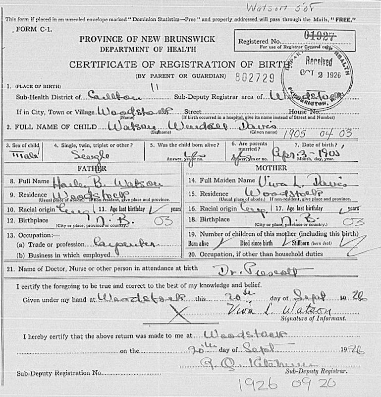 Parents Father: WATSON, Harleigh Ballentyne Mother: DAVIS, Viva Lee Birth Born on April 03, 1905 in Woodstock, Carleton Co., NB Death Died on 1960 in Massachusetts, USA Buried in Hanover Center Cemetery in Hanover, Plymouth Co., MA Marriages SUTTON, Margaret Louise Married on April 24, 1928 in Woodstock, Carleton Co., NB Children WATSON, Julie Ann: December 13, 1936 - June 07, 2025 Notes Occupation: Bank Accountant/ Accountant United Nations Sources Findagrave.com: https://www.findagrave.com/memorial/217713893/wendell-d-watson Images Wendall Davis Birth Wendall & Margaret (Sutton) Watson Wendall Watson Marriage