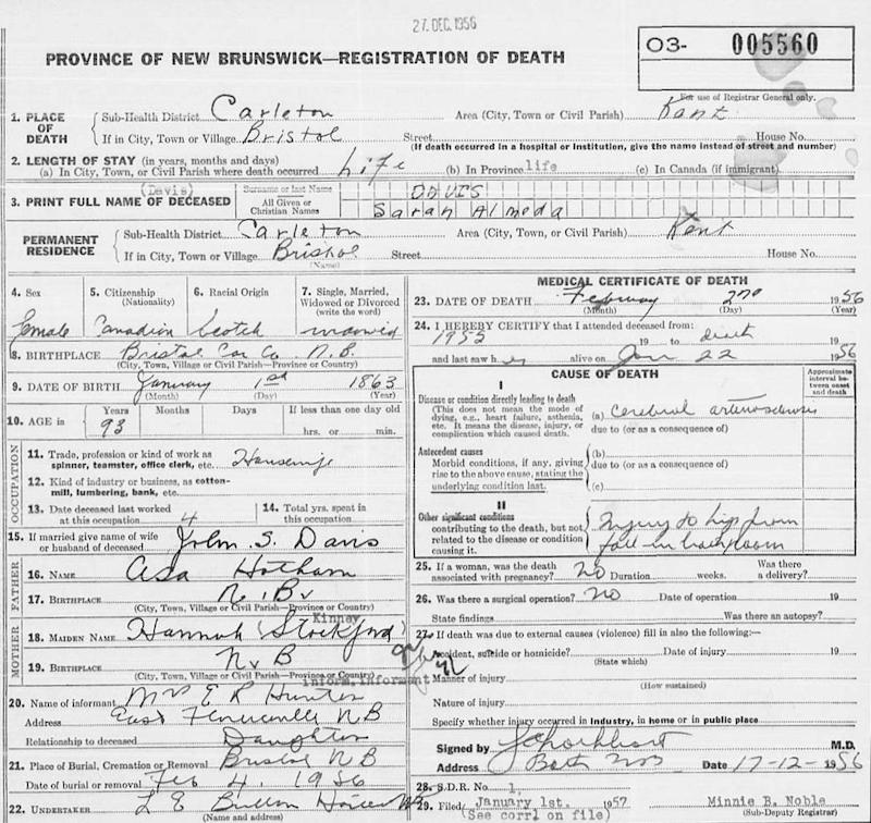 Birth Born on January 01, 1863 in Bristol, Carleton Co., NB Death Died on February 27, 1956 in Bristol, Carleton Co., NB Buried in Bristol Old Cemetery in Bristol, Carleton Co., NB Marriages DAVIS, John Stockford Married on 1880 Children DAVIS, Viva Lee: June 21, 1886 - 1983 Notes Death: Cerebral Arteriosclerosis Sources NB Deaths: #5560 Images John & Sarah (Hotham) Davis Sarah (Hotham) Davis Death