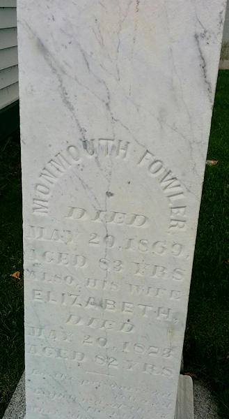 Birth Born on June 30, 1791 in Hampton, Kings Co., NB Death Died on May 20, 1873 in Hampton, Kings Co., NB Buried in St. Paul's Anglican Church Cemetery in Hampton, Kings Co., NB Marriages FOWLER, Monmouth Married on June 29, 1809 in Kingston, Kings Co., NB Children FOWLER, Ezra Frost: May 21, 1810 - June 14, 1846 FOWLER, William: February 07, 1812 - 1904 Notes Marriage Notice: m. Kingston, Thursday eve., by Rev. Scovil, Monmouth FOWLER / Eliza second d/o Capt. William FROST of that place. The New Brunswick Royal Gazette Fredericton,NB July 3,1809 Obituary: d. Hampton Station (Kings Co.) 21st inst., Elizabeth FOWLER relict of Monmouth FOWLER, Esq., age 82. Funeral Saturday 24th inst., 11 o'clock a.m. from residence of her son, J. Upham FOWLER. The Daily Telegraph Saint John,NB May 22,1873 Sources NB Cemeteries: St. Paul's Anglican Cemetery, Hampton,NB Images Monmouth Fowler, Elizabeth Frost,Ezra & William Fowler Birth Family Bible Monmouth & Elizabeth (Frost) Fowler