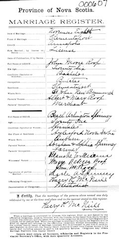 Parents Father: SPINNEY, Abraham B. Mother: LEONARD, Sophia Birth Born on March 02, 1890 in Greenwood, Kings Co., NS Marriages ROOP, John Moore Married on November 08, 1909 in Clementsport, Annapolis Co., NS Children ROOP, Albert Leonard: 1910 - 1990 Images Pearl Spinney Marriage