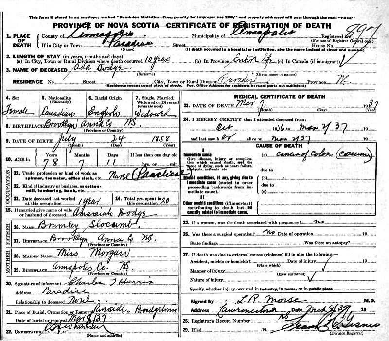 Parents Father: SLOCOMB, Walter Bromley Mother: MORGAN, Sarah E. Birth Born on July 24, 1858 in Brooklyn, Annapolis Co., NS Death Died on March 07, 1937 in Paradise, Annapolis Co., NS Buried in Riverside Cemetery in Bridgetown, Annapolis Co., NS Marriages DODGE, Amariah Married on July 11, 1887 in Wilmot, Annapolis Co., NS Notes Death: Cancer of Colon Occupation: Practical Nurse Sources Nova Scotia Deaths: Book 138 Pg. 897 Images Ada (Slocomb) Dodge Death Amariah Dodge Marriage