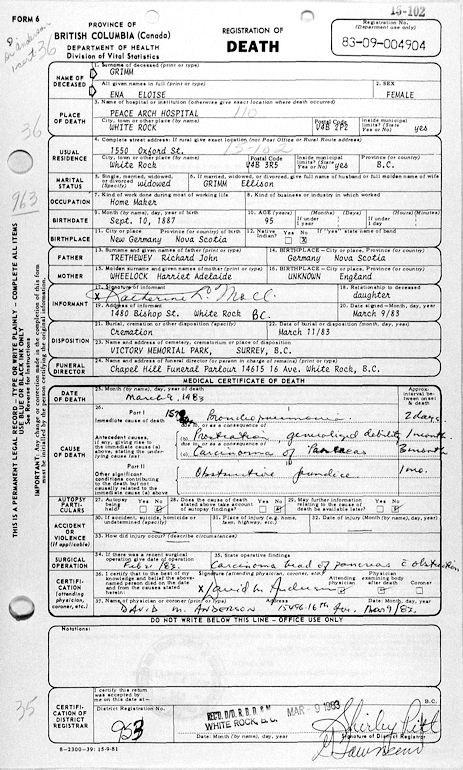 Parents Father: TRETHEWEY, Richard John Mother: WHEELOCK, Henrietta Adelaide Birth Born on September 10, 1887 in New Germany, Lunenburg Co., NS Death Died on March 09, 1983 in White Rock, Metro Vancouver Region, BC Buried in Cremation Marriages CONRAD, William Walter Married on September 08, 1909 in New Germany, Lunenburg Co., NS GRIMM, Ellison William Children CONRAD, Elsie Marion: 1910 - 1957 CONRAD, Katherine Lyle: August 05, 1912 CONRAD, Walter Allan Grenville: April 03, 1920 - December 01, 1987 Notes Death: Bronchopneumonia Sources BC Deaths: 83-09-004904 Images Ena (Trethewey) Grimm Death Ena Trethewey Marriage Ethel-,Jessie,Ena-,Minnie- Trethewey Ena-,Ethel-,Minnie-,Jessie Trethewey Ena Tretheway Jessie & Ena Tretheway