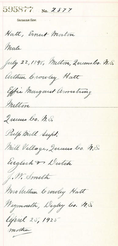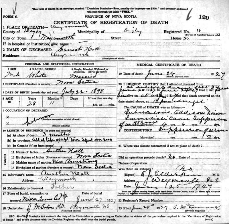 Parents Father: HATT, Arthur Crawley Mother: ARMSTRONG, Effie Flora Margaret Birth Born on July 22, 1898 in Milton, Queens Co., NS Death Died on June 24, 1927 in Weymouth, Digby Co., NS Buried in Milton Community Cemetery in Milton, Queens Co., NS Marriages FORBES, Lillian Belle Married on May 22, 1920 in Liverpool, Queens Co., NS Children HATT, Russell Morton: July 18, 1921 Notes Occupation: Mill Worker Death: Tuberculosis/ Addisons Disease Sources Nova Scotia Deaths: Book 121 Pg. 120 Images Ernest Hatt Birth Ernest Hatt Ernest Hatt Death Ernest Hatt Marriage