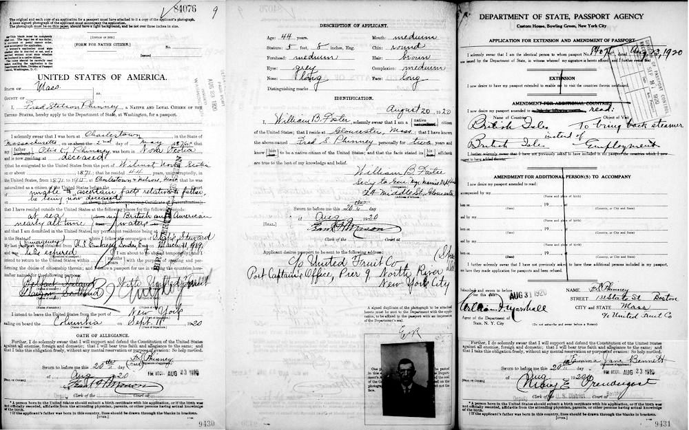 Parents Father: PHINNEY, Otis King Mother: STETSON, Lucy Rebecca Birth Born on May 02, 1876 in Boston, Suffolk Co., MA Notes Occupation: Ships Stewart - United Fruit Co./ Theatre Clerk Images Fred S. Phinney Birth Fred S. Phinney WW1 Draft Fred S. Phinney Passport Fred S. Phinney