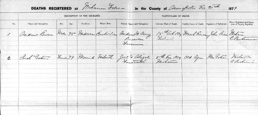 Parents Father: FARNSWORTH, Joel Mother: FALES, Abigail Birth Born on 1795 in Nictaux, Annapolis Co., NS Death Died on December 05, 1874 in Nictaux, Annapolis Co., NS Buried in Community Cemetery in Nictaux, Annapolis Co., NS Marriages GATES, Silas Married on December 14, 1815 in Nictaux, Annapolis Co., NS Children GATES, Busby: June 13, 1827 - February 12, 1906 Notes Death: Old Age Sources Nova Scotia Deaths: Book 1801 Pg. 89 #189 Annapolis Cemetery Records: Nictaux Community Cemetery #76 Images Sarah (Farnsworth) Gates Death