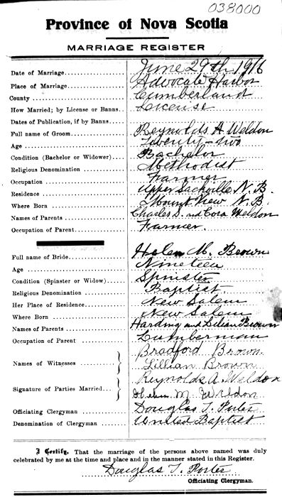 Parents Father: BROWN, Robert Harding Mother: BOWLSBY, Lillian May Birth Born on February 03, 1897 in New Salem, Cumberland Co., NS Death Died on December 21, 1993 in Sackville, Westmorland Co., NB Marriages WELDON, Reynolds Arthur Married on June 29, 1916 in Advocate Harbour, Cumberland Co., NS Children WELDON, Victor Eugene: February 03, 1925 - March 14, 1925 Sources Mormons: https://www.familysearch.org/tree/person/details/LH6D-VH9 Images Helen M. Brown Birth Helen M. Brown Marriage