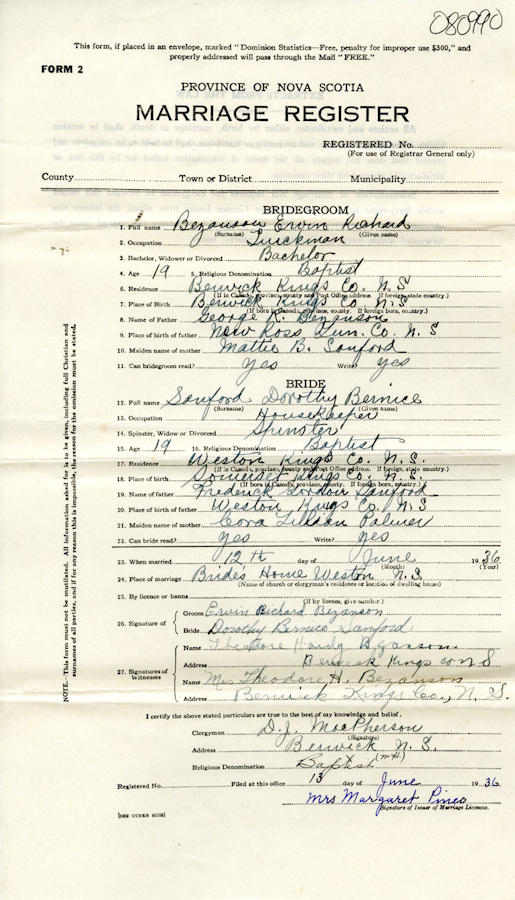 Parents Father: BEZANSON, George Richard Mother: SANFORD, Mattie Boyce Birth Born on September 01, 1916 in Berwick, Kings Co., NS Death Died on September 01, 1986 in Kings Co., NS Buried in Berwick Cemetery in Berwick, Kings Co., NS Marriages SANFORD, Dorothy Bernice Married on June 12, 1936 in Weston, Kings Co., NS Children BEZANSON, Lillian Boyce: January 30, 1937 - June 08, 1940 Notes Occupation: Truckman Sources Findagrave.com: https://www.findagrave.com/memorial/199108206/ervin_richard-bezanson Images Ervin Bezanson Birth Ervin Bezanson Marriage