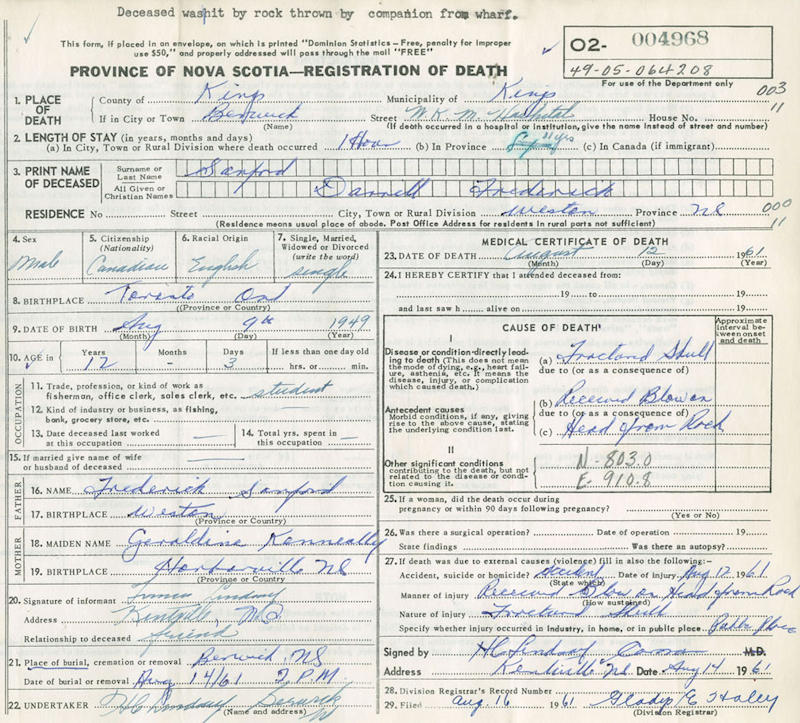 Parents Father: SANFORD, Frederick Gordon Mother: KENNEALLY, Geraldine Louise Birth Born on August 09, 1949 in Toronto, ON Death Died on August 12, 1961 in Berwick, Kings Co., NS Buried in Berwick Cemetery in Berwick, Kings Co., NS Notes Death: Fractured Skull Received a blow on the head from a rock. Sources Nova Scotia Deaths: Year 1961 #4968 Images Darrell Sanford Death