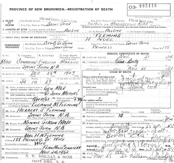 Parents Father: FLEMING, Herbert James Mother: NASE, Mary Gibson Birth Born on December 25, 1907 in Saint John, Saint John Co., NB Death Died on November 21, 1952 in Saint John, Saint John Co., NB Buried in Fernhill Cemetery in Saint John, Saint John Co., NB Marriages McLEAN, Eleanor Maud Married on June 23, 1937 in Saint John, Saint John Co., NB Notes Occupation: Service Station Operator/ General Manager of Car Dealer Death: Broken Neck from an automobile accident Sources NB Deaths: #5446 Images Herbert N. Fleming Birth Herbert N. Fleming Death Herbert N. Fleming Marriage