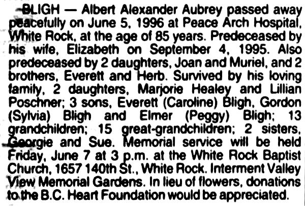 Parents Father: BLIGH, Aubrey Mother: ABERNATHY, Jane Anna Birth Born on April 16, 1911 in Gerald, Melville Census Division, SK Death Died on June 05, 1996 in White Rock, Metro Vancouver Region, BC Buried in Valley View Memorial Gardens in Surrey, Metro Vancouver Region, BC Marriages JOHNSTONE, Marjorie Elizabeth Children BLIGH, Joan BLIGH, Muriel BLIGH, Marjorie BLIGH, Lillian BLIGH, Everett BLIGH, Gordon BLIGH, Elmer Sources Findagrave.com: https://www.findagrave.com/memorial/210154469/albert-alexander_aubrey-bligh Images Albert & Marjorie (Johnstone) Bligh Albert A. Bligh Obit
