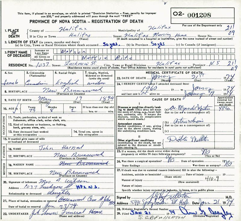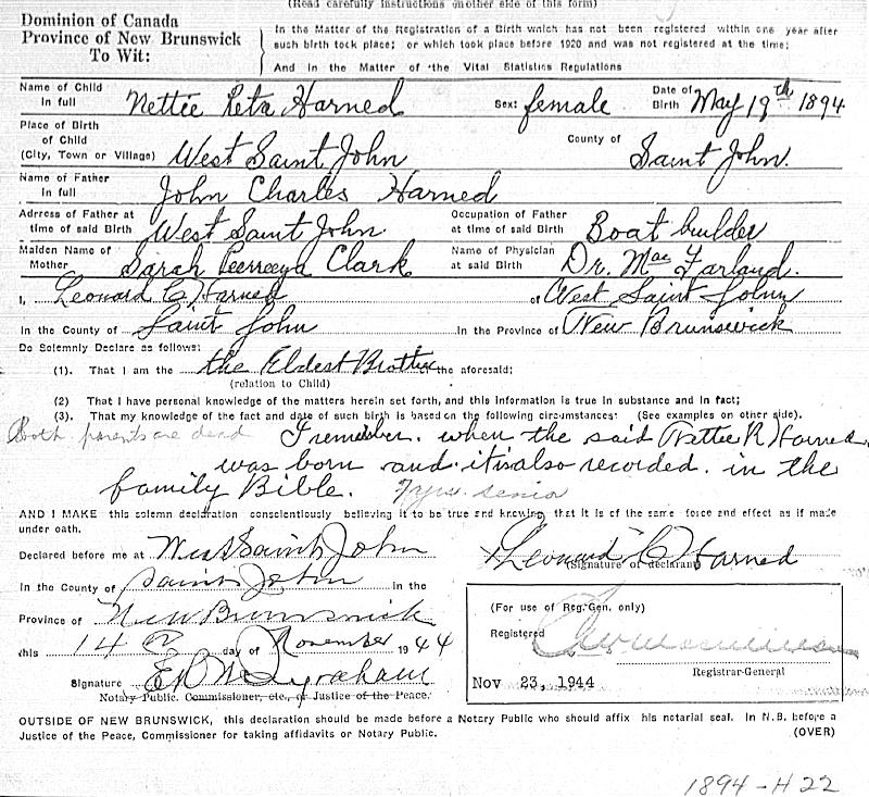 Parents Father: HARNED, John Charles Mother: CLARK, Sarah Pereizah Birth Born on May 19, 1894 in Saint John, Saint John Co., NB Death Died on January 21, 1974 in Halifax, Halifax Regional Municipality, NS Buried in Greenwood Cemetery in Saint John, Saint John Co., NB Marriages WATSON, Errol Reade Married on October 07, 1914 in Saint John Co., NB Children WATSON, Harlie Edward: October 16, 1915 - January 14, 1997 WATSON, Ariel Emily: March 25, 1917 WATSON, Enoch John: October 03, 1921 - October 03, 1921 Notes Death: Myocardial Infarction Sources Nova Scotia Deaths: Year 1974 #1208 Images Nettie Harned Birth Nettie (Harned) Watson Death Errol Watson Marriage
