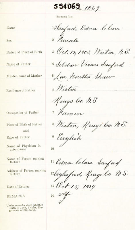 Parents Father: SANFORD, Seldon Vicars Mother: SHAW, Love Minetta Birth Born on October 12, 1903 in Weston, Kings Co., NS Death Died on February 22, 1990 in Eagan, Dakota Co., MN Buried in Plummerville Cemetery in Fennville, Allegan Co., MI Marriages HAAK, Leo Arthur Married on November 26, 1930 in Granville, Licking Co., OH Children HAAK, Avery Andrew: May 04, 1932 HAAK, Alice C.: December 31, 1933 - August 10, 2017 Sources Cemetery: Plummerville Cemetery Fennville,MI Plot: 7-88-2 Minnesota Deaths: #003270 Images Edna Sanford Birth Edna (Sanford) Haak Edna Sanford Marriage