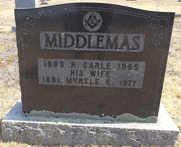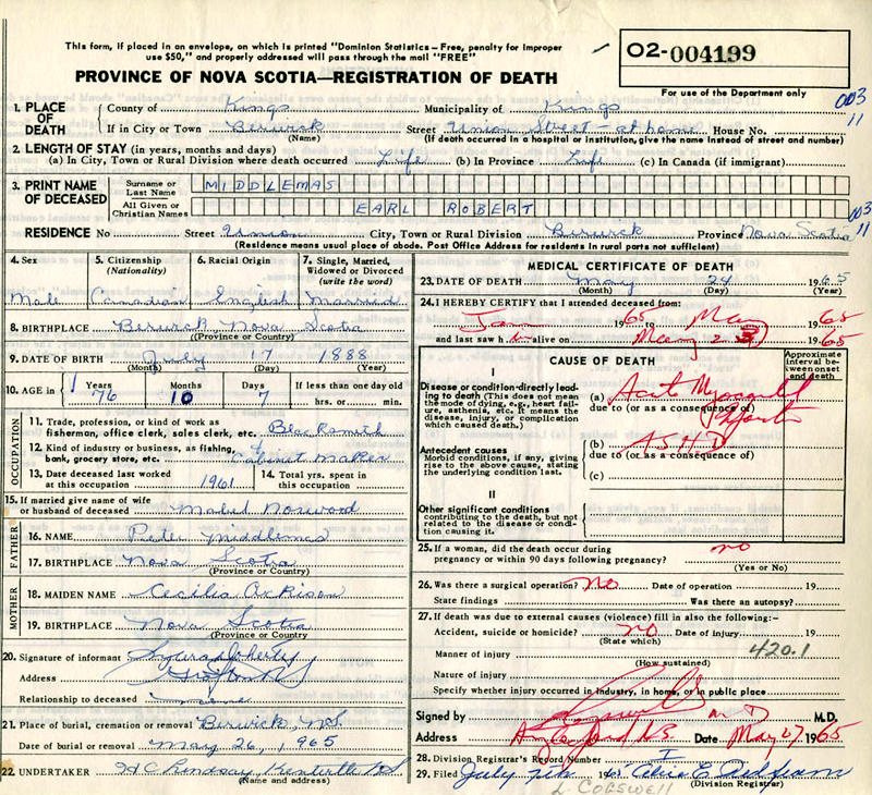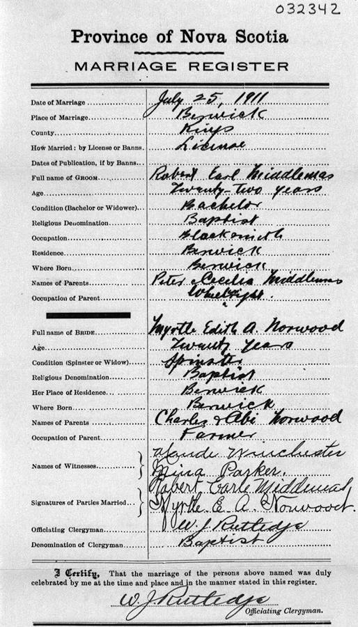 Parents Father: MIDDLEMAS, Peter Mother: ATKINS, Cecelia Birth Born on January 19, 1890 in Berwick, Kings Co., NS Death Died on May 24, 1965 in Berwick, Kings Co., NS Buried in Berwick Cemetery in Berwick, Kings Co., NS Marriages NORWOOD, Myrtle Edith Adelia Married on July 25, 1911 in Berwick, Kings Co., NS Children MIDDLEMAS, Charles Robert: August 19, 1912 - 1980 Notes Occupation: Blacksmith Death: Acute Myocardial Infarction Sources Nova Scotia Deaths: Year 1965 #4199 Images Robert Middlemas Birth Robert & Myrtle (Norwood) Middlemas Robert Middlemas Death Myrtle Norwood Marriage