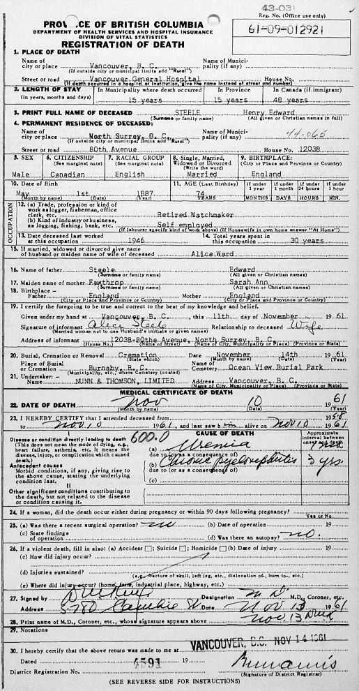 Birth Born on May 01, 1887 in Outwood Wakefield, Yorkshire, England Death Died on November 10, 1961 in Vancouver, Metro Vancouver Region, BC Buried in Ocean View Burial Park in Burnaby, Metro Vancouver Region, BC Marriages WARD, Alice Married on 1912 in Knaresborough, Yorkshire, England Children STEELE, Marjorie Vivien: January 11, 1918 Notes Occupation: Watchmaker Death: Uremia/ Chronic Pyelonephistis Sources BC Deaths: 61-09-012921 Images Henry Steele Henry Steele Death