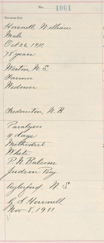 Birth Born on January 06, 1833 in Fredericton, York Co., NB Death Died on October 26, 1911 in Weston, Kings Co., NS Buried in Aylesford Union Cemetery in Aylesford, Kings Co., NS Marriages MACMILLAN, Bertha Ann Children HORSNELL, Charles Sans: February 03, 1873 - March 01, 1939 Notes Occupation: Farmer Death: Paralysis Sources Berwick Register: November 16, 1911 Nova Scotia Deaths: Book 12 Pg. 162 #1001 Images William Horsnell Death
