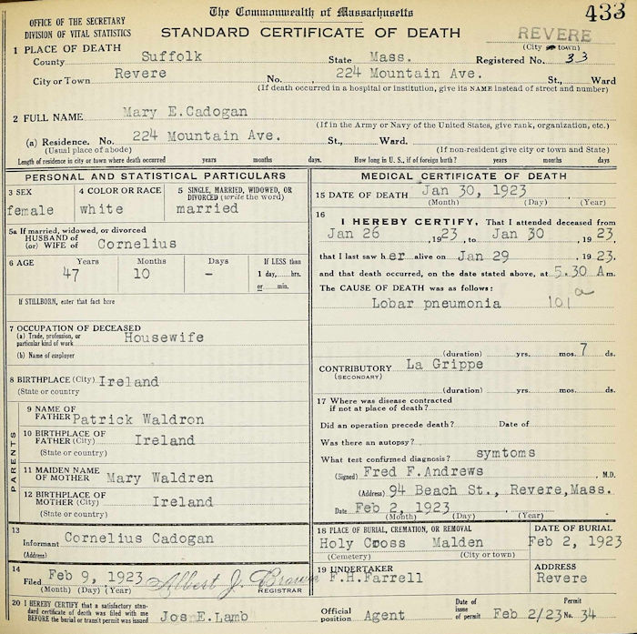 Birth Born on 1875 in Co. Mayo, Ireland Death Died on January 30, 1923 in Revere, Suffolk Co., MA Buried in Holy Cross Cemetery in Malden, Middlesex Co., MA Marriages CADOGAN, Cornelius A. Married on April 17, 1912 in Cambridge, Middlesex Co., MA Children CADOGAN, Walter Waldron: January 17, 1916 - May 16, 1999 Notes Death: Lobar Pneumonia/ La Grippe Sources Massachusetts Deaths: Revere Pg. 433 #33 Images Mary (Waldron) Cadogan Death Cornelius Cadogan Marriage