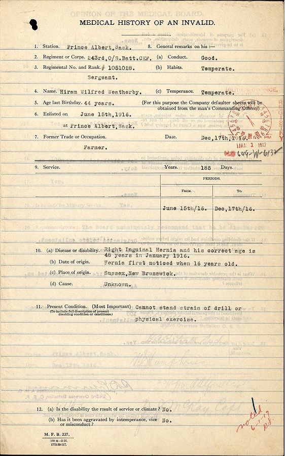Parents Father: WEATHERBY, Elisha John Mother: ACORN, Jane Rubelle Birth Born on January 06, 1868 in Vernon River, Queens Co., PE Death Died on May 19, 1945 in Haney, Metro Vancouver Region, BC Marriages REIGEL, Edith Blanche Married on August 03, 1896 in Chinook, Chouteau Co., MT KIRWAN, Elizabeth Children WEATHERBY, Hugh Wallace: December 23, 1908 - January 01, 1985 Notes Military Service: WW1 CEF Sergeant Occupation: Farmer/ Cattle Dealer Sources BC Deaths: 1945-09-662541 Images Hiram Weatherby PEI Baptism Record Hiram Weatherby WW1 Military Attestation1 Hiram Weatherby WW1 Military Attestation Hiram Weatherby WW1 Military Medical1 Hiram Weatherby WW1 Military Medical2 Hiram Weatherby WW1 Military Medical3 Hiram Weatherby WW1 Military Medical Hiram Weatherby WW1 Military Pay