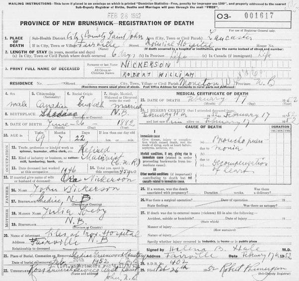 Parents Father: NICKERSON, John S. Mother: SOWERBY, Julia Ann Birth Born on June 29, 1882 in Shediac, Westmorland Co., NB Death Died on February 17, 1952 in Fairville, Saint John Co., NB Buried in Greenwood Cemetery in Shediac, Westmorland Co., NB Marriages FISHER, Ora Agnes Married on February 20, 1909 in Moncton, Westmorland Co., NB Children NICKERSON, Robert George Fisher: August 26, 1910 NICKERSON, Julia Dorothy: March 11, 1912 NICKERSON, Anna Margaret Grant: October 12, 1919 Notes Occupation: Machinist - CNR Death: Broncho Pneumonia Sources NB Deaths: #03-001617 Images Robert W. Nickerson Birth Robert W. Nickerson Death Ora Fisher Marriage