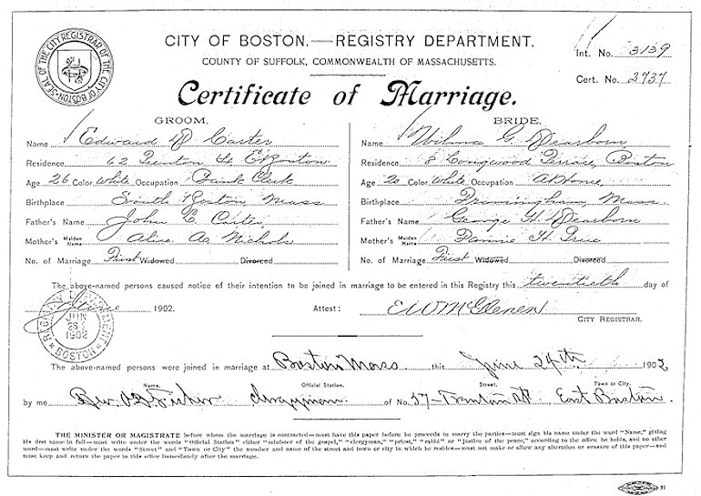 Parents Father: CARTER, John L. Mother: NICHOLS, Alice A. Birth Born on February 16, 1876 in Boston, Suffolk Co., MA Death Died on 1967 in Wakefield, Middlesex Co., MA Buried in Winthrop Cemetery in Winthrop, Suffolk Co., MA Marriages DEARBORN, Wilma G. Married on June 24, 1902 in Boston, Suffolk Co., MA Children CARTER, Dearborn: October 04, 1910 - October 04, 1910 Notes Occupation: Bank Clerk/ Bank Bookkeeper/ Bank Secretary/ Accountant - Massachusetts Gov't Images Edward D. Carter Birth Edward D. Carter Marriage