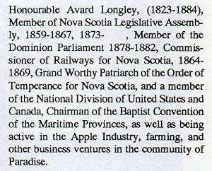 Parents Father: LONGLEY, Asaph Mother: POOLE, Dorcas Birth Born on February 22, 1823 in Paradise, Annapolis Co., NS Death Died on February 22, 1884 in Paradise, Annapolis Co., NS Buried in Paradise Cemetery in Paradise, Annapolis Co., NS Marriages TROOP, Charlotte Augusta Married on September 26, 1855 in Wolfville, Kings Co., NS Children LONGLEY, Mary Florence: 1856 - April 03, 1862 LONGLEY, Henry Avard: July 21, 1859 - June 01, 1944 LONGLEY, Ernest Israel: 1862 - April 30, 1865 LONGLEY, Annie Lucy Sophia: July 21, 1863 - December 22, 1946 LONGLEY, Howard William: January 06, 1867 - February 15, 1936 LONGLEY, Winnifred Isabell Manning: October 11, 1871 - July 07, 1950 Notes Election: Member Provincial Parliament MPP/ Canada Parliament MP Obituary: Avard LONGLEY died at his home in Paradise, Friday. He was in his usual health in the morning, took his breakfast and about 10 o'clock died of heart disease. He died on his 61st birthday, having been born at Paradise 22 Feb 1823. For many years he was one of the prominant men in the Conservative Party. He represented Annapolis County in the House of Assembly from 1859 to 1867, holding part of this time the office of Railway Commissioner and afterwards sat for a term in the House of Commons from 1878 to 1882. He was a leading member of the Baptist body. J.W. LONGLEY, M.P.P. for Annapolis was a nephew of the deceased. The Daily Telegraph Saint John,NB February 25,1884 Occupation: Merchant Sources Annapolis Cemetery Records: Paradise Cemetery #80 Images Avard Longley Avard Longley History Avard Longley