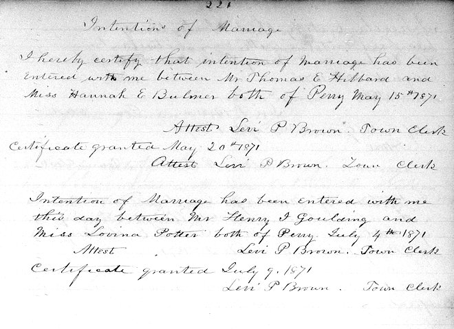 Parents Father: GOULDING, Daniel Mother: STICKNEY, Lucilla M. Birth Born on January 27, 1849 in Perry, Washington Co., ME Death Died in Perry, Washington Co., ME Buried in Gleason Road Cemetery in Perry, Washington Co., ME Marriages POTTER, Sarah Lovina Married on July 09, 1871 in Perry, Washington Co., ME Children GOULDING, Ernest Bliss: April 02, 1873 Notes Occupation: Carpenter Images Henry Goulding Marriage