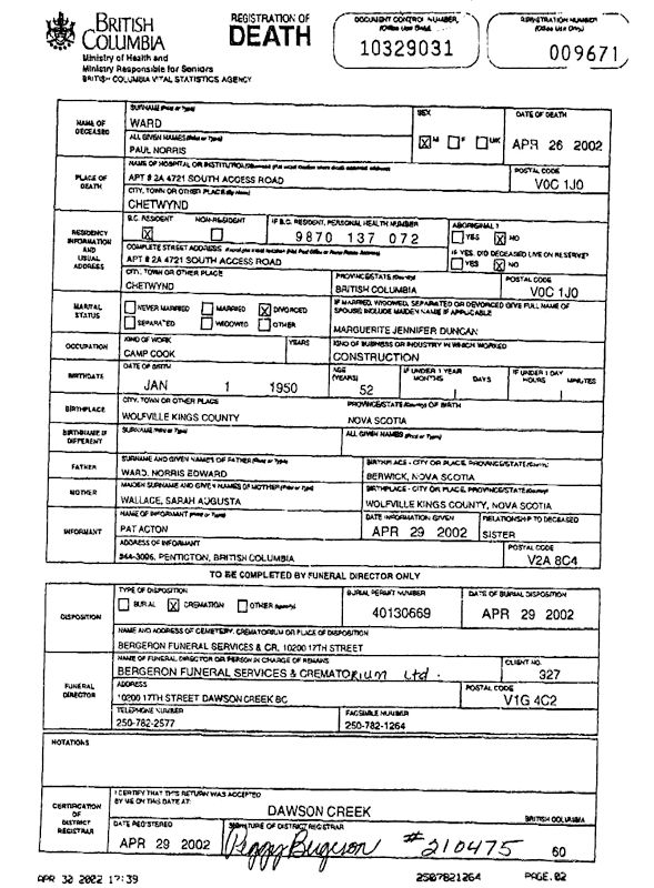 Parents Father: WARD, Norris Edward Mother: WALLACE, Sara Augusta Birth Born on January 01, 1950 in Wolfville, Kings Co., NS Death Died on April 26, 2002 in Chetwynd, Peace River Region, BC Buried in Willow Bank Cemetery in Wolfville, Kings Co., NS Marriages DUNCAN, Marguerite Jennifer Married on July 06, 1974 in Wolfville, Kings Co., NS Notes Occupation: Camp Cook Death: Suicide - Rifle Wound Sources BC Deaths: #9671 Images Marion (Ward) Mapplebeck & Paul Ward Paul Ward Death1 Paul Ward Death