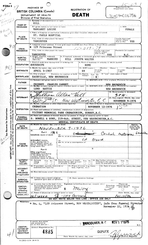 Parents Father: PHINNEY, Charles Garnet Wolsley Mother: LUND, Hattie May Birth Born on April 03, 1907 in Sackville, Westmorland Co., NB Death Died on November 09, 1976 in Vancouver, Metro Vancouver Region, BC Marriages HILL, Joseph Walter Married on May 01, 1929 in Vancouver, Metro Vancouver Region, BC Children HILL, William Allan Notes Death: Breast Cancer/ Cerebral Metasis Burial: Cremation Occupation: Mulltigraph Operator Sources BC Deaths: #76-09-016756 Images Margaret (Phinney) Hill Death Margaret L. Phinney Marriage