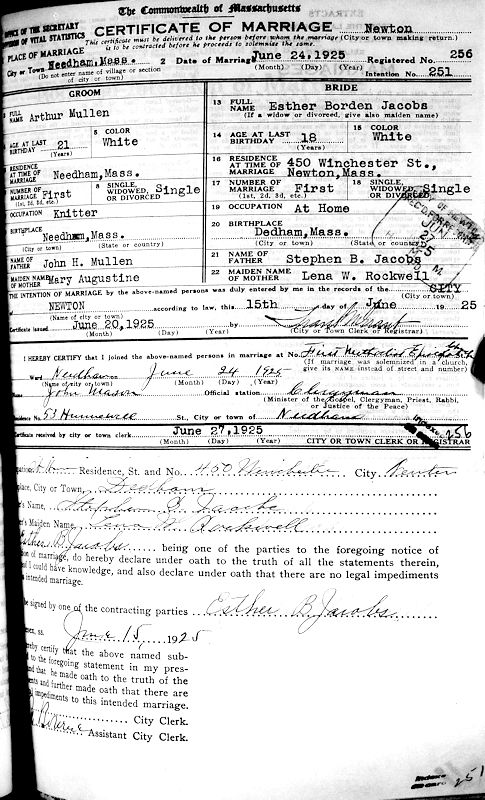 Parents Father: JACOBS, Stephen Barston Mother: ROCKWELL, Lena Willie Birth Born on May 23, 1907 in Dedham, Norfolk Co., MA Death Died on January 05, 1989 in Falmouth, Barnstable Co., MA Buried in Mayflower Cemetery in Duxbury, Plymouth Co., MA Marriages MULLEN, Arthur H. Married on June 24, 1925 in Needham, Norfolk Co., MA Children MULLEN, Wendel MULLEN, Arthur Howard: September 16, 1927 - May 07, 1999 MULLEN, Donald Walter: June 02, 1931 - April 10, 2011 MULLEN, Glenn Wallace: September 03, 1936 - 1936 MULLEN, Bruce Rockwell: February 22, 1938 - October 21, 1987 MULLEN, Dianne Shirley: January 25, 1940 MULLEN, Wayne Kenneth: September 27, 1943 - February 01, 2005 Sources Massachusetts Deaths: #016991 Massachusetts Cemeteries: Mayflower Cemetery Duxbury,MA Spruce Avenue, lot 700A, gr. Memorial Garden Images Esther Jacobs Birth Esther Jacobs Marriage