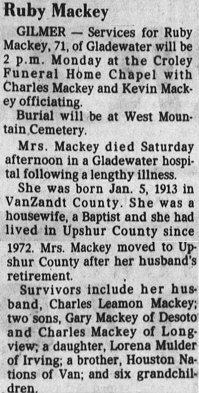 Birth Born on January 05, 1913 in Grand Saline, Van Zandt Co., TX Death Died on October 27, 1984 in Gladewater, Gregg & Upshur Co., TX Buried in West Mountain Cemetery in West Mountain, Upshur Co., TX Marriages MACKEY, Charles Leaman Children MACKEY, Charles Leaman: November 12, 1939 - October 28, 2006 MACKEY, Karen: March 29, 1942 - April 08, 1942 MACKEY, Gary Wade: December 26, 1944 - November 07, 2000 MACKEY, Mamie Lorena: January 19, 1953 Notes Death: Died suddenly of a heart attack while getting out of the car, at her house in Union Grove, Upshur Co.,TX Images Charles & Ruby (Nations) Mackey Ruby (Nations) Mackey Obit Longview News - Journal Oct 28,1984