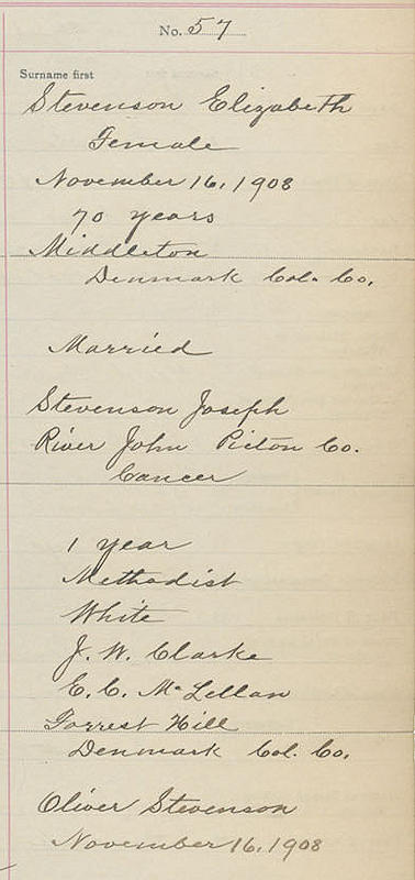 Parents Father: JOLLIMORE, William Mother: LANGILLE, Lucy Birth Born on 1838 in River John, Pictou Co., NS Death Died on November 16, 1908 in Denmark, Colchester Co., NS Buried in Forest Hill Cemetery in Denmark, Colchester Co., NS Marriages STEVENSON, Joseph Married on December 13, 1854 in River John, Pictou Co., NS Children STEVENSON, Elmer: nil 0, 1880 STEVENSON, James William: July 06, 1855 - March 26, 1901 STEVENSON, Jane: 1857 - November 20, 1875 STEVENSON, Robert: March 10, 1860 STEVENSON, Agnes: 1862 - November 16, 1875 STEVENSON, Sarah: 1864 - December 02, 1875 STEVENSON, Susan: March 15, 1865 STEVENSON, Lucy: 1866 - November 23, 1875 STEVENSON, Isaac: 1870 - November 28, 1875 STEVENSON, John Wesley: May 28, 1872 - December 20, 1939 STEVENSON, Catherine: 1874 - October 15, 1875 STEVENSON, Jenette: 1875 STEVENSON, Oliver: April 09, 1876 - October 29, 1935 STEVENSON, Thomas Allen: February 03, 1880 - October 27, 1945 STEVENSON, Jane M.: February 04, 1888 - May 16, 1934 Notes Death: Cancer Sources Nova Scotia Deaths: Book 4 Pg. 10 #57 Images Elizabeth (Jollimore) Stevenson Death