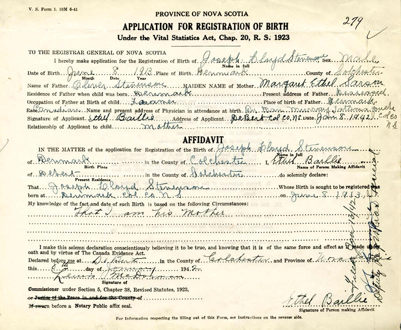 Parents Father: STEVENSON, Oliver Mother: SARSON, Margaret Ethel Birth Born on June 08, 1913 in Denmark, Colchester Co., NS Death Died on August 16, 1977 in Tatamagouche, Colchester Co., NS Buried in Forest Hill Cemetery in Denmark, Colchester Co., NS Marriages STEVENS, Muriel Blanche Married on September 03, 1941 in Glenholme, Colchester Co., NS Children STEVENSON, Marlene STEVENSON, Anne Notes Occupation: Labourer Obituary: Tatamagouche - Joseph Lloyd STEVENSON, 64, died Tuesday in the Lillian Fraser Memorial Hospital, Tatamagouche. Born in Denmark, he was a son of the late Oliver and Ethel (SARSON) STEVENSON. He was a veteran of the Second World War and a member of the Royal Canadian Legion, branch 64, Tatamagouche. He was a past noble grand of Liberty Lodge 1200 IOOF, Tatamagouche. He was a senior warden Grand Encampment, IOOF. He was a long time trustee of the board of management of the Lillian Fraser Memorial Hospital and he was chairman of the board of management of the Willow Lodge Senior Citizens Home. He was also president of the Senior Citizens Village Club. He is survived by his wife, the former Muriel STEVENSON, Debert; two daughters, Marlene (Mrs. William MURPHY), Fairview; Anne (Mrs. Garth J. McADOO), Halifax; two sisters, Mae (Mrs. Harold PORTER), Mabou; Muriel HAYMAN, Denmark; and one granddaughter. Funeral service was held at 2 p.m. Thursday from Sharon United Church, Tatamagouche, Rev. Kenneth ROBINSON officiating, assisted by Rev. Morley BENTLEY and Rev. Gordon MATHESON. Burial was in the Forest Hill Cemetery, Denmark. Military Service: WW2 RC Army Sergeant Sources Colchester Cemeteries: Denmark Forest Hill Cemetery #94 Findagrave.com: https://www.findagrave.com/memorial/124222057/joseph-stevenson Images Joseph L. Stevenson Birth Joseph L. & Muriel (Stevens) Stevenson Joseph L. Stevens Marriage