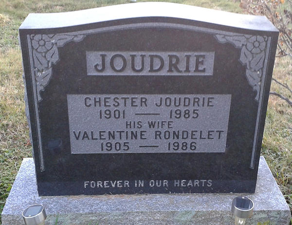 Parents Father: JOUDRIE, Archibald Mother: LANGILLE, Christina Birth Born on March 17, 1901 in River John, Pictou Co., NS Death Died on June 09, 1985 in River John, Pictou Co., NS Buried in Hamilton Cemetery in River John, Pictou Co., NS Marriages RONDELET, Valentine Marie Married on March 17, 1928 in Westville, Pictou Co., NS Children JOUDRIE, Julius Alfred: March 31, 1929 - October 26, 2017 Notes Occupation: Fisherman Sources Rootsweb - Paul Crant: ID: I619080146 Images Chester & Valentine (Rondelet) Joudrie