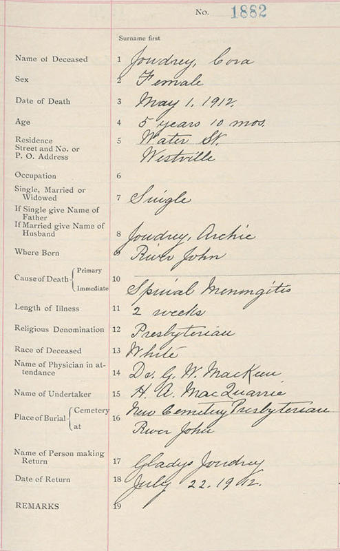 Parents Father: JOUDRIE, Archibald Mother: LANGILLE, Christina Birth Born on 1907 in River John, Pictou Co., NS Death Died on May 01, 1912 in Westville, Pictou Co., NS Buried in Bellevue Cemetery in River John, Pictou Co., NS Notes Death: Spinal Meninghitis Sources Nova Scotia Deaths: Book 14 Pg. 314 #1882 Images Cora Joudrie Cora Joudrie Death