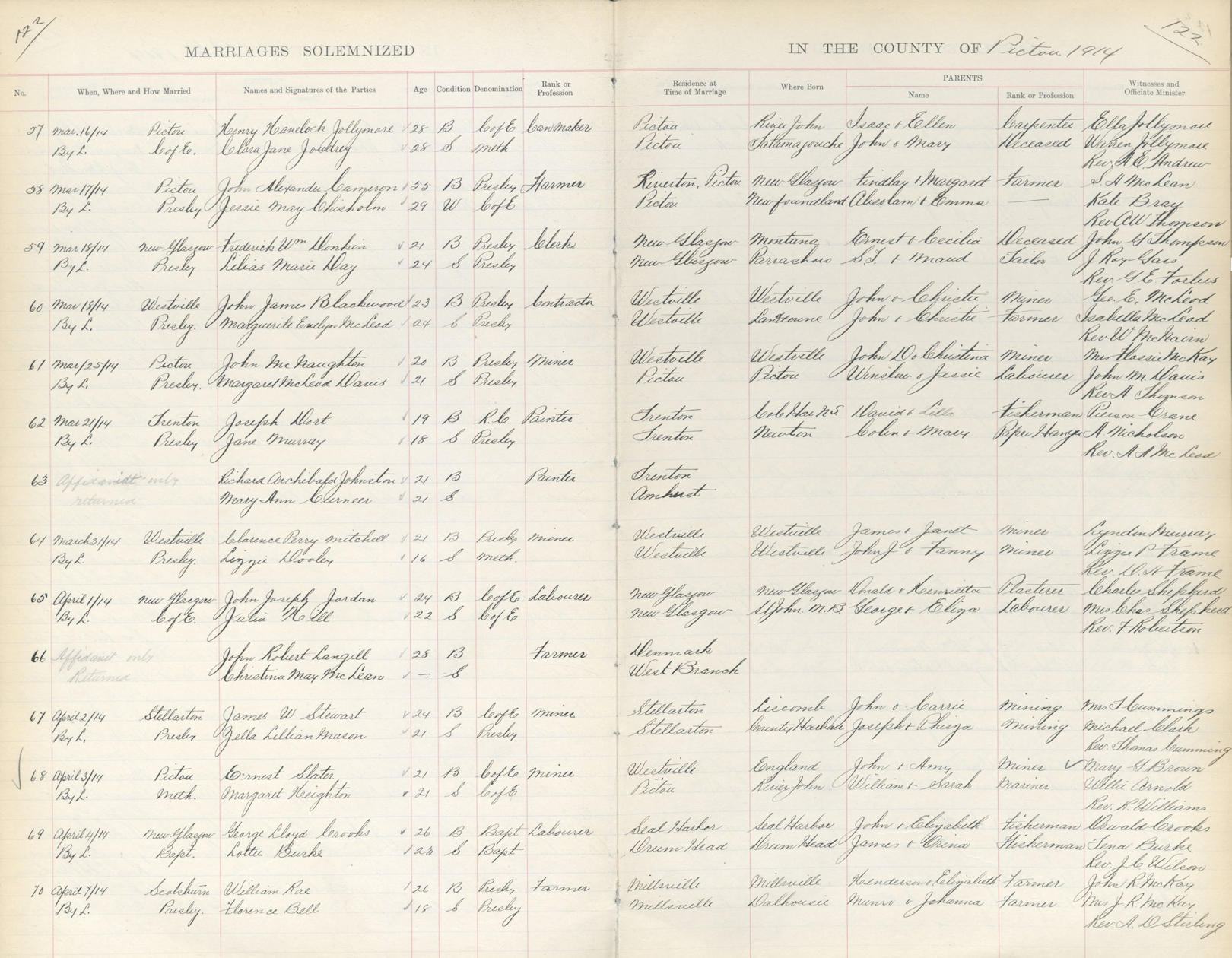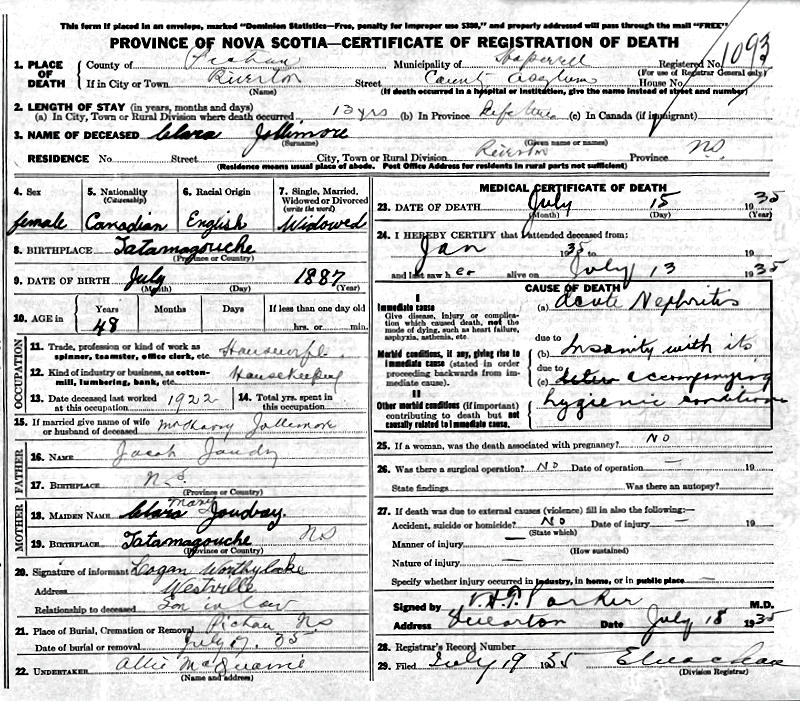 Parents Father: JOUDRIE, John Henry Mother: LANGILLE, Mary McBurnie Birth Born on July 22, 1886 in Tatamagouche, Colchester Co., NS Death Died on July 15, 1935 in Riverton, Pictou Co., NS Buried in Pictou, Pictou Co., NS Marriages JOLLYMORE, Harry Havelock Married on March 16, 1914 in Pictou, Pictou Co., NS Children JOLLYMORE, Pearl Agnes: May 30, 1908 - June 28, 1957 JOLLYMORE, Harriet Kathleen: December 03, 1913 JOLLYMORE, Thomas: 1917 JOLLYMORE, Harry Cecil: April 29, 1920 - July 23, 1944 Notes Death: Acute Nephritis/ Insanity Sources Nova Scotia Deaths: Book 151 Pg. 1093 Images Clara (Joudrie) Jollymore Death Clara Joudrie Marriage