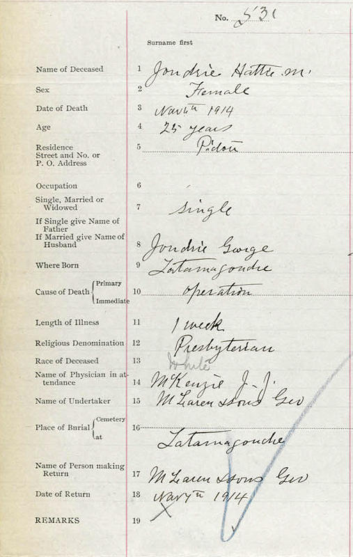 Parents Father: JOUDRIE, John Henry Mother: LANGILLE, Mary McBurnie Birth Born on May 01, 1889 in Tatamagouche, Colchester Co., NS Death Died on November 06, 1914 in Pictou, Pictou Co., NS Buried in Tatamagouche, Colchester Co., NS Sources Nova Scotia Deaths: Book 44 Pg. 142 #531 Images Hattie Joudrie Death