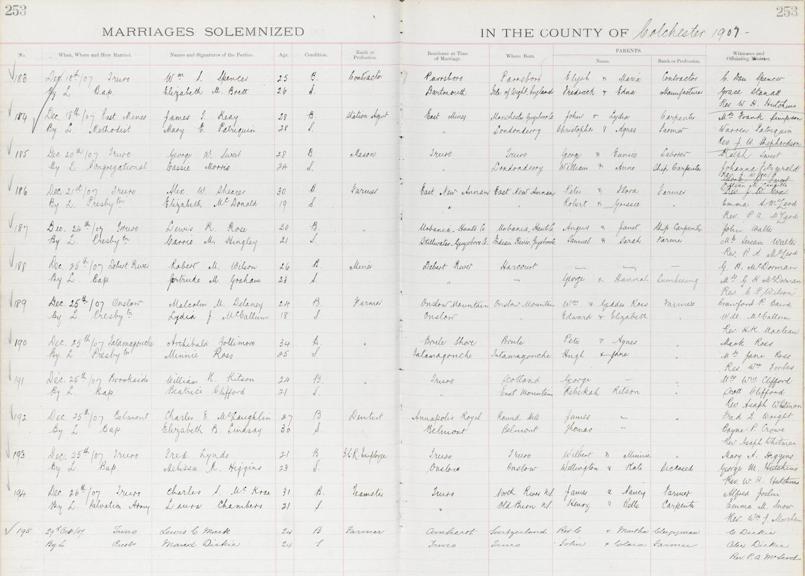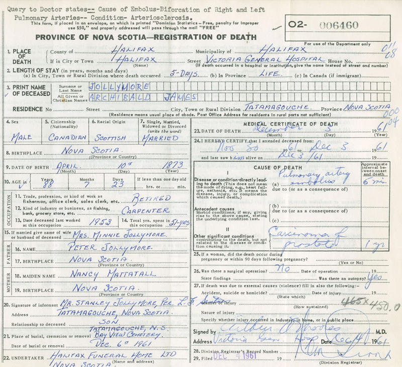 Birth Born on April 10, 1873 in Tatamagouche, Colchester Co., NS Death Died on December 03, 1961 in Halifax, Halifax Regional Municipality, NS Buried in Bayview Cemetery in Waldegrave, Colchester Co., NS Marriages ROSS, Minnie Jane Married on December 25, 1907 in Tatamagouche, Colchester Co., NS Children JOLLYMORE, Ernest: September 21, 1914 - October 27, 1992 Notes Occupation: Farmer/ Carpenter Death: Pulmonary Embolism Sources Colchester Cemeteries: Waldegrave Cemetery #2 Nova Scotia Deaths: Year 1961 #6460 Images Archibald Jollimore Birth Archibald Jollimore Death Archibald Jollimore Marriage