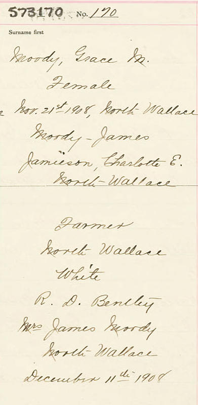 Parents Father: MOODY, James Mother: JAMIESON, Charlotte Amelia Birth Born on November 21, 1908 in North Wallace, Cumberland Co., NS Death Died on July 02, 1994 in Tatamagouche, Colchester Co., NS Buried in Lockerby Memorial Cemetery in Tatamagouche, Colchester Co., NS Marriages JOUDRIE, Beldon Children JOUDRIE, Henry JOUDRIE, Trueman JOUDRIE, William JOUDRIE, Rosevil: July 14, 1925 - August 02, 1996 JOUDRIE, Mary Viola: September 27, 1927 - October 10, 2018 JOUDREY, Hilda Mae: March 29, 1929 - November 09, 2008 JOUDRIE, Stanley James: November 05, 1931 - November 27, 1992 JOUDRIE, Clara Edna: 1933 - July 15, 2003 JOUDRIE, Phyllis: September 06, 1939 - November 13, 2021 JOUDRIE, Jessie A.: 1942 Sources Rootsweb - Penny Lane: ID: I14770 Images Grace Moody Birth Beldon & Grace (Moody) Joudrie