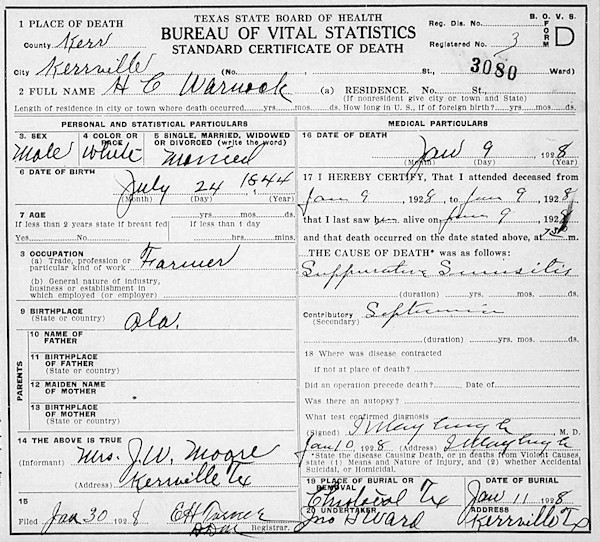 Birth Born on July 24, 1844 in White Plains, Benton Co., AL Death Died on January 09, 1928 in Kerrville, Kerr Co., TX Buried in Christoval Cemetery in Christoval, Tom Green Co., TX Marriages ANDREWS, Ida Married on November 13, 1867 in White Plains, Calhoun Co., AL Children WARNOCK, Amanda A.: June 10, 1884 - July 04, 1984 Notes Occupation: Farmer Military Service: US Civil War Confederate Army Death: Suppurative Sinusitis/ Septicemia Sources Texas Deaths: Kerr Co.,TX #3080 Images Henry Warnock Henry Warnock Death Henry Warnock