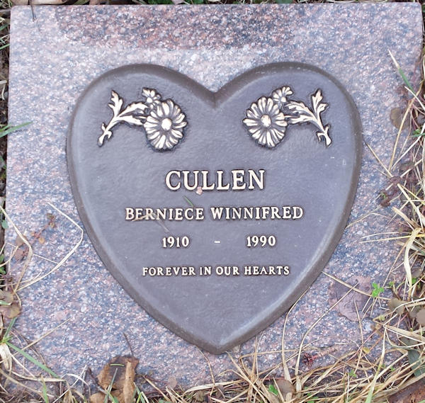 Parents Father: LANGILLE, Elijah Henry Mother: MACKENZIE, Bessie Margaret Birth Born on March 28, 1910 in Plymouth, Pictou Co., NS Death Died on July 31, 1990 in Hopewell, Pictou Co., NS Buried in Hopewell Cemetery in Hopewell, Pictou Co., NS Marriages CULLEN, John David Married on June 17, 1933 in Stellarton, Pictou Co., NS Children CULLEN, Irma CULLEN, Lawrence CULLEN, John CULLEN, Theodore CULLEN, David CULLEN, Allan CULLEN, Raymond CULLEN, Robert Alexander: September 29, 1934 - September 05, 1979 CULLEN, Dennis Murray: 1937 - July 25, 2013 Notes Obituary: July 31, 1990 Hopewell -- Berniece Winnifred Cullen, 80, of Valley View Villa, Riverton, formerly of this community, died Tuesday evening in the Villa. Born in Stellarton, she was a daughter of the late Elizah and Bessie Langille. She lived in Hopewell all of her married life, and was a member of The First Presbyterian Church, Hopewell. She survived by a daughter, Irma (Mrs. William Cook), MacLellan's Brook; six sons, Dennis, Foxbrook; John (Jack), Hilden; Theodore, Westville; David, Six Mile Brook; Allan, Hopewell; and Raymond, White Hill. 21 grandchildren, 10 great-grandchildren ; a brother, Lewis, Vancouver Island; a sister Margueritta, Valley View Villa. She was predeceased by her husband, John David; two sons, Robert, and Lawrence in infancy; two brothers, Harry and Jack; and four sisters, Catherine, Minnie, Alvira and Bessie. Her remains are resting at the H.C. MacQuarrie Funeral Home in Stellarton, with visiting from 2-4 and 7-9 p.m. on Thursday, from where the funeral service will be held Friday at 1:30 p.m. Interment in the Foxbrook Cemetery. Family flowers only. Donations may be made to Valley View Villa or the Canadian Diabetic Association. Images Bernice Langille Birth Bernice (Langille) Cullen Bernice Langille Marriage Bernice Langille