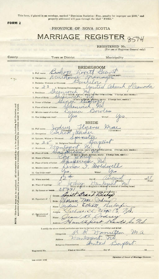 Parents Father: BISHOP, George Lovett Watson Mother: BOWLES, Laura Burgess Birth Born on July 09, 1914 in Greenwich, Kings Co., NS Death Died on March 21, 2003 in Wolfville, Kings Co., NS Marriages JODREY, Florence May Married on August 12, 1937 in Hantsport, Hants Co., NS Children BISHOP, Marianne Jean: 1946 - September 07, 1982 Notes Occupation: Warehouse Manager Sources My Heritage: https://www.myheritage.com/profile-OYYV7I2MMQJB3NBVI2I5S7CSPBFLVSI-1500015/lovett-grant-bishop# Images Lovett & Lorna Bishop Birth Lovett Bishop Marriage
