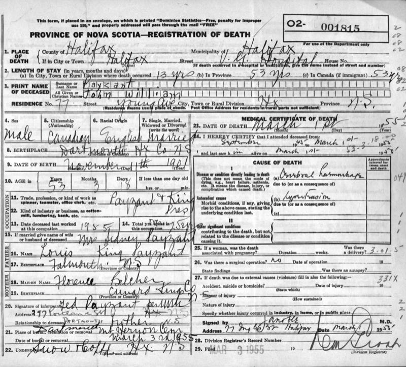 Parents Father: PAYZANT, Lewis King Mother: BELCHER, Florence Delia Birth Born on November 11, 1901 in Dartmouth, Halifax Co., NS Death Died on March 01, 1955 in Halifax, Halifax Regional Municipality, NS Buried in Mount Hermon Cemetery in Dartmouth, Halifax Co., NS Marriages SHAW, Sidney Carmen Married on August 13, 1923 in St. Kitts, BWI Children PAYZANT, Sidney Jane PAYZANT, John Shaw PAYZANT, Lewis John: June 08, 1924 - June 08, 2002 PAYZANT, Geoffrey Barrs: March 07, 1926 - August 31, 2004 Notes Occupation: President Payzant & King Wholesale Grocer Death: Cerebral Hemorhage Sources Nova Scotia Deaths: Book 1955 Pg. 1815 Images John & Sidney (Shaw) Payzant John Payzant Death John Payzant Death