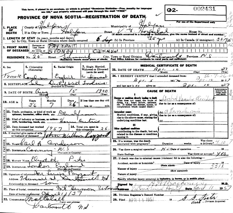 Parents Father: SHAW, Carl Addison Mother: PIKE, Elizabeth Ann Birth Born on August 15, 1900 in Saba, Dutch West Indies Death Died on April 10, 1957 in Halifax, Halifax Regional Municipality, NS Buried in Mount Hermon Cemetery in Dartmouth, Halifax Co., NS Marriages PAYZANT, John William Married on August 13, 1923 in St. Kitts, BWI Children PAYZANT, Sidney Jane PAYZANT, John Shaw PAYZANT, Lewis John: June 08, 1924 - June 08, 2002 PAYZANT, Geoffrey Barrs: March 07, 1926 - August 31, 2004 Notes Death: Cerebral Vascular Accident Sources Nova Scotia Deaths: Year 1957 #2431 Images John & Sidney (Shaw) Payzant Sidney (Shaw) Payzant Death Sidney (Shaw) Payzant Death