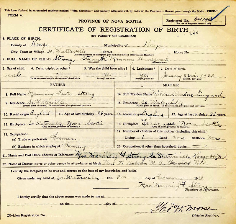 Parents Father: STRONG, Manning Foster Mother: LINGARD, Mildred Evadne Birth Born on January 23, 1922 in South Waterville, Kings Co., NS Death Died on July 29, 2001 Buried in Cambridge United Baptist Cemetery in Cambridge Station, Kings Co., NS Marriages AALDERS, Pauline Joyce Married on November 06, 1943 in Kentville, Kings Co., NS Children STRONG, Catherine STRONG, Victor Ervin STRONG, Gerald STRONG, David STRONG, Cameron STRONG, Larry Sources Findagrave.com: https://www.findagrave.com/memorial/168961946/stuart_manning_haverlock-strong Images Stuart Strong Birth Stuart & Pauline ((Aalders) Strong Stuart Strong Marriage