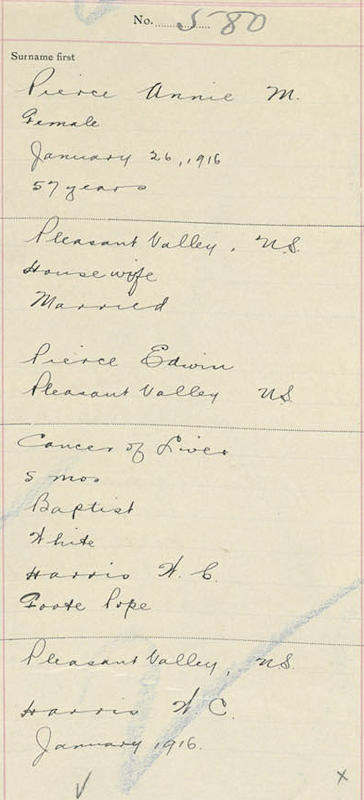 Birth Born on January 31, 1859 in Pleasant Valley, Kings Co., NS Death Died on January 26, 1916 in Pleasant Valley, Kings Co., NS Buried in Pleasant Valley, Kings Co., NS Marriages PIERCE, Edwin Parker Children PIERCE, William Edwin: May 15, 1894 - 1969 Notes Death: Cancer of Liver Sources Berwick Register: Obituary February 9, 1916 Nova Scotia Deaths: Book 40 Pg. 153 #580 Images Anne (Margeson) Pierce Death