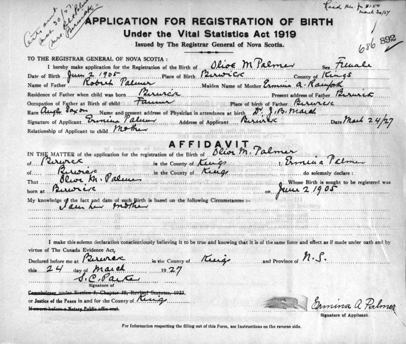Parents Father: PALMER, Robert Bordman Mother: RAINFORTH, Ermina Anna Birth Born on June 02, 1905 in Berwick, Kings Co., NS Death Died on July 13, 1930 in Chelsea, Suffolk Co., MA Buried in Berwick Cemetery in Berwick, Kings Co., NS Sources Berwick Register: Obituary July 23, 1930 Images Olive Palmer Birth Robert & Ermina (Rainforth) & Olive Palmer