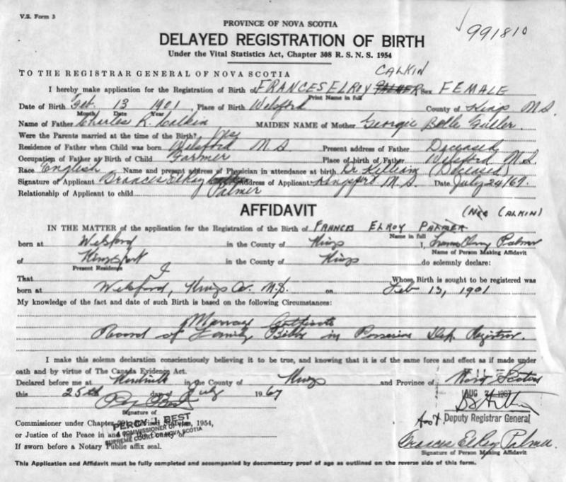 Parents Father: CALKIN, Charles Rufus Mother: FULLER, Georgie Bell Birth Born on February 13, 1901 in Welsford, Kings Co., NS Death Died on December 28, 1996 in Coldbrook, Kings Co., NS Buried in Berwick Cemetery in Berwick, Kings Co., NS Marriages PALMER, Miles Simpson Married on August 31, 1921 in Welsford, Kings Co., NS Children PALMER, Gerald Neilson: July 11, 1922 - March 02, 2008 PALMER, Miriam Frances: October 23, 1925 - October 20, 2022 PALMER, Keith Calkin: 1931 - October 10, 2015 PALMER, Avard Miles: June 14, 1934 - May 26, 2014 Notes Death: Pneumonia Obituary: PALMER, Frances Calkin - 95, Coldbrook, Kings Co., formerly of Kentville, died December 28, 1996, at the home of her granddaughter, Vicki and her husband Garnet Misner, Coldbrook. Born in Welsford, Kings Co., she was a daughter of the late Charles and Georgie (Fuller) Calkin. She was a member of the women's ministry of the Pentecostal Church, Kingsway Assembly; member of the Progressive Conservative Ladies Club; Minas 50 Plus and New Horizons Seniors groups. She was a descendant of the Planters. Surviving are daughter, Miriam (Mickie) Ward, Coldbrook; sons, Gerald, New Minas; Keith, Billtown; Avard, Canning; sisters, Mrs. Lillian Flemons, Kentville; halfbrother, Harold, Berwick; 21 grandchildren; 45 great-grandchildren; two great-great-grandchildren. She was predeceased by her husband, Miles S.; granddaughters, Valerie, Jennifer; grandson, Stephen; great-granddaughter, Tammy; sister, Erminie; half-sister, Lorna; brothers, Edmund, Arthur. Visitation 2-4, 7-9 p.m. today in W.C. Hiltz Funeral Parlour, Kentville. Funeral 3:15 p.m. Tuesday in the Pentecostal Church, Kingsway Assembly, Belcher Street, Kentville, Pastor Finley Burt and Pastor Winston Osmond officiating. Burial in Berwick Cemetery. Donations to the Pentecostal Church, Kingsway Assembly. Sources Newspaper Obituary: Obituary December 1996 Images Frances Calkin Birth Miles & Frances (Calkin) & Steven & Valerie Palmer Miles Palmer Marriage